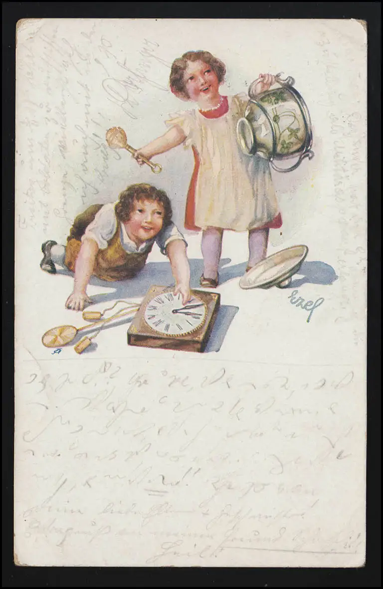 AK enfants font de la musique avec la poêle et l'horloge, signe. Ezef WIENNE vers 1910