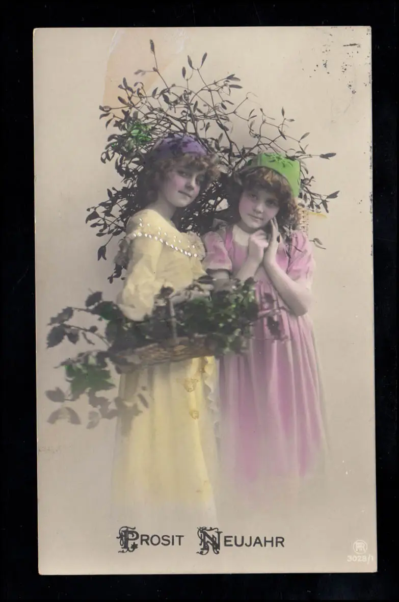 AK photo Nouvel An: Deux filles avec des branches et panier, coloré, ZÜRICH 30.12.1911