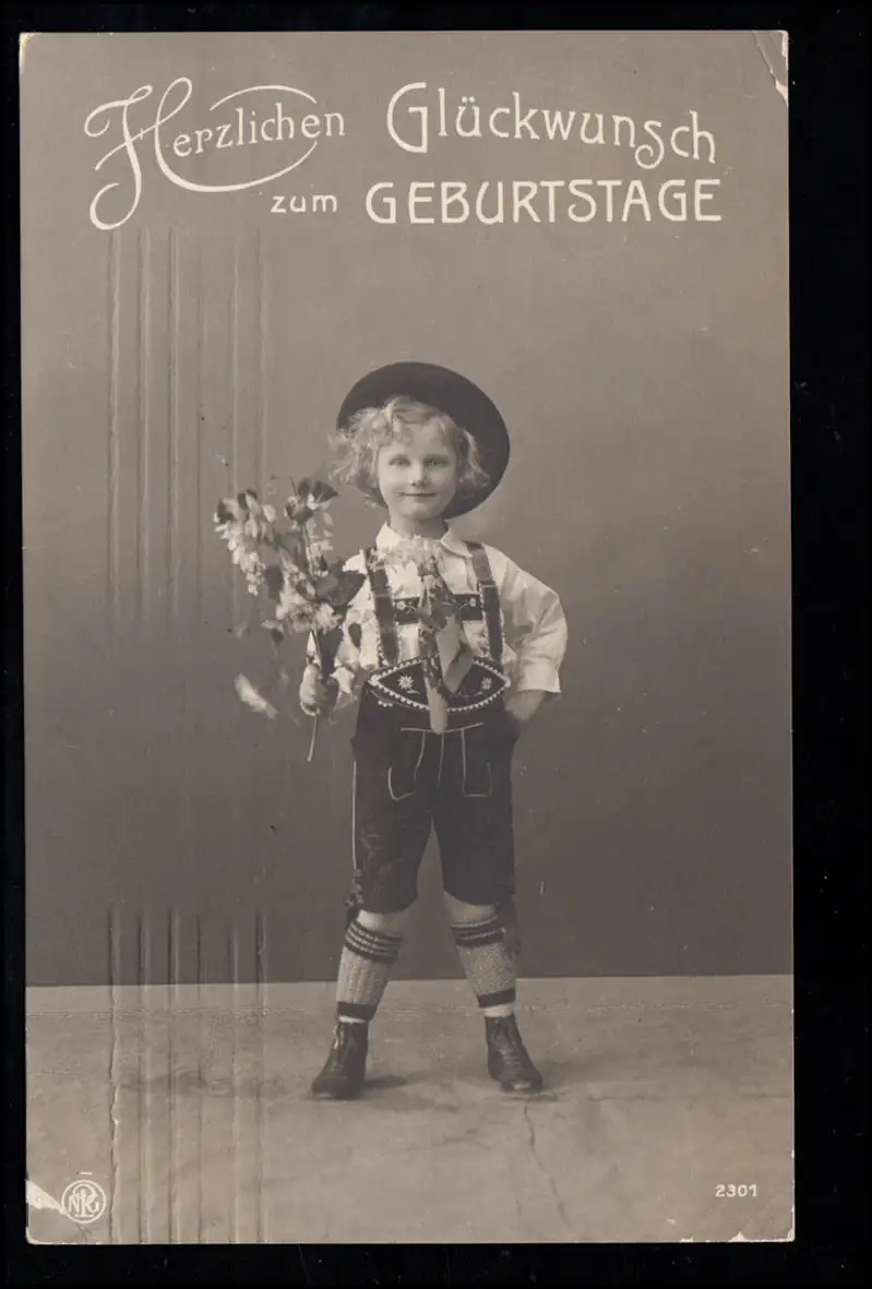 AK pour enfants Anniversaire: Les garçons en cuir chapeau fleurs, censure WÜRZBURG 8.11.1915