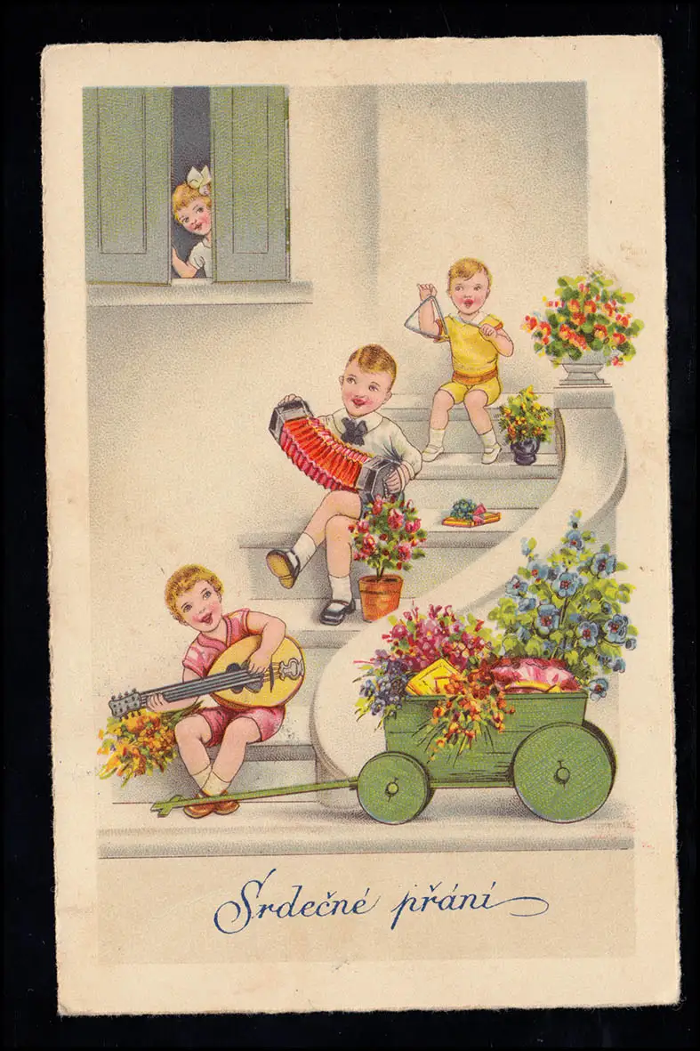 AK pour enfants La table d'anniversaire avec Triangel Harmonika Mandoline, 24.3.1941