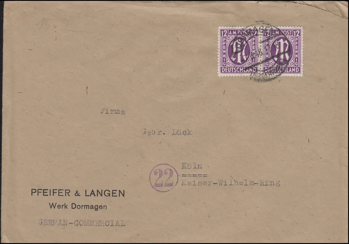 AM-Post 12 p. paire MeF sur la lettre longue distance DORMAGEN 7.3.1946 à Kölm