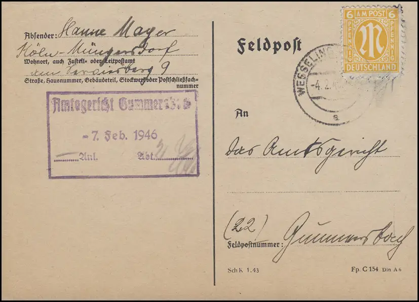 AM-Post 6 Pf. EF Carte postale WESSELING 4.2.46 au tribunal de l'Amtsgericht de Gummersbach