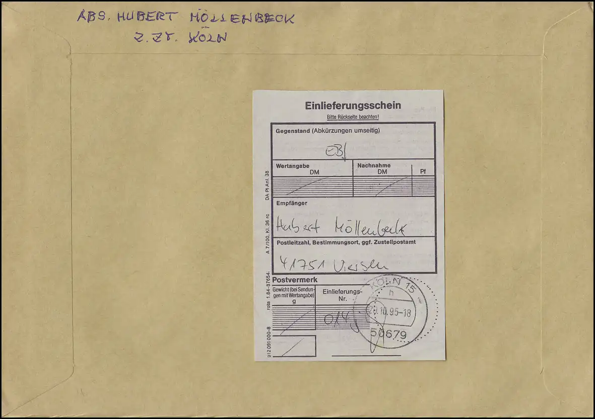ATM 2.1.1. Sanssouci 5 valeurs 50+200 p.m. MiF R-Lettre SSt Cologne PHILATELIA 20.10.95
