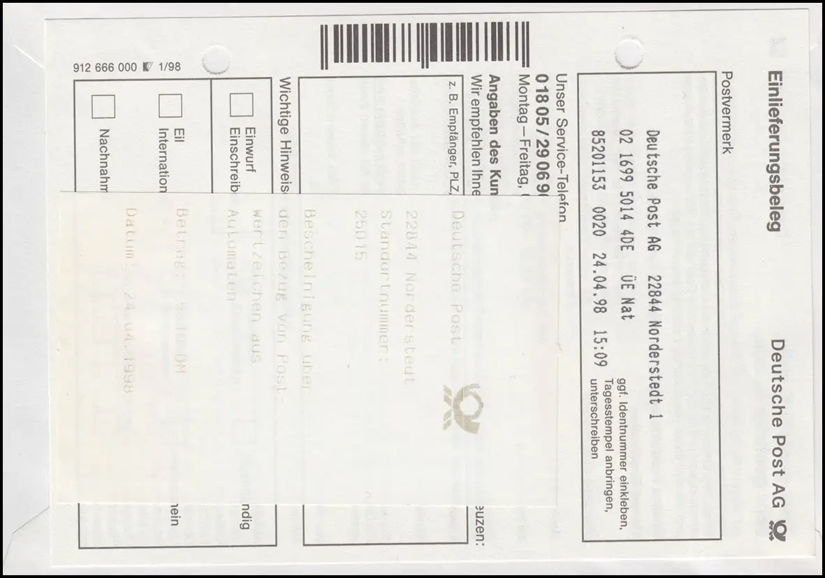 ATM 2.2.1. Olivetti PIA 510 EF FDC NoorderSTEDT 24.4.98 avec billet et reçu électronique