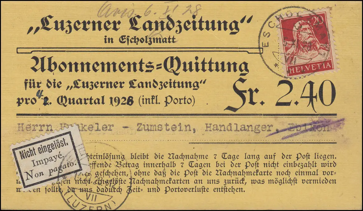 Quotité d'abonnement au journal terrestre de la Luzerne ESCHOLZMAT 5.12.28 selon EBICON 6.12.27