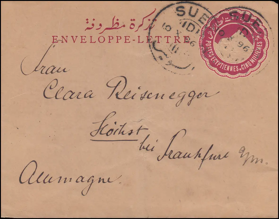 Egypte Pyramide 5 Mill. rouge Carte postale SUEZ 10.10.1896 vers Allemagne