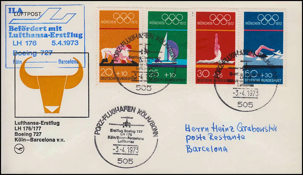 Aéroport Lufthansa Premier vol LH 176/ 177 Boeing 727 Cologne / Barcelone 3. + 5.4.1973