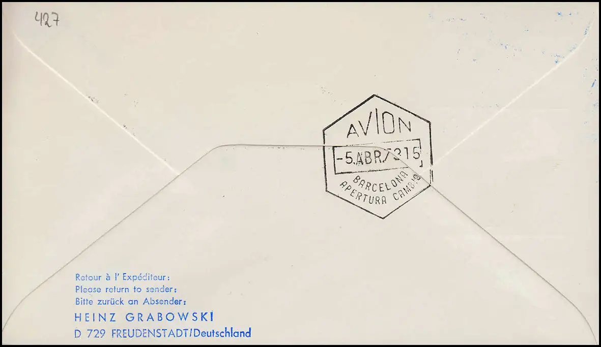 Tampon bleu ILA transporté avec Lufthansa Premier vol LH 176 1.4.1973 Boeing 727 Cologne - Barcelone. Tag d'arrivée noir: VISION Barcelona Apertura Cambio 5. Abr.73 Vérification: original Référence produit: milliard026261>Remarque: Cet article n'est disponible qu'une seule fois. Vous recevrez exactement l'article représenté.