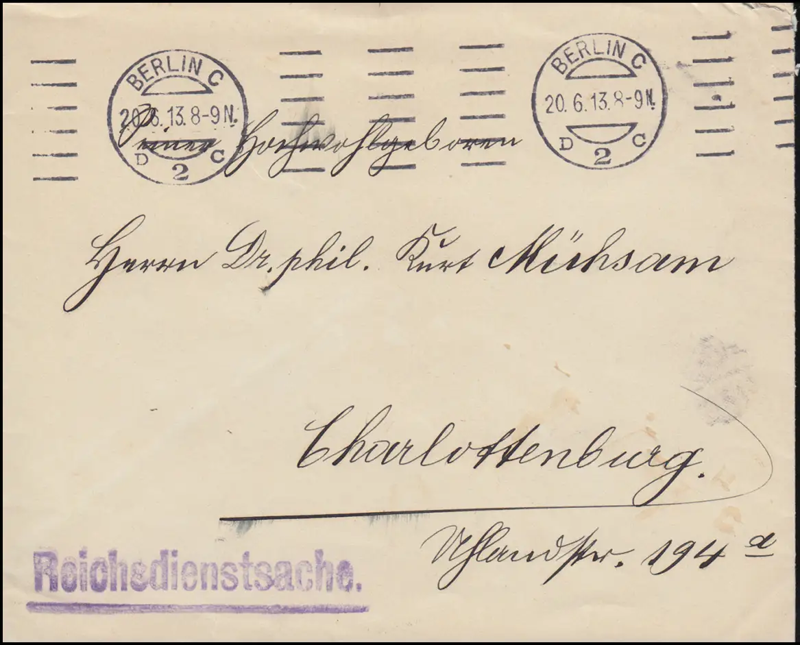 Affaire Reichsserviced'office des affaires étrangères Lettre BERLIN 20.6.1913 à Charlottenburg