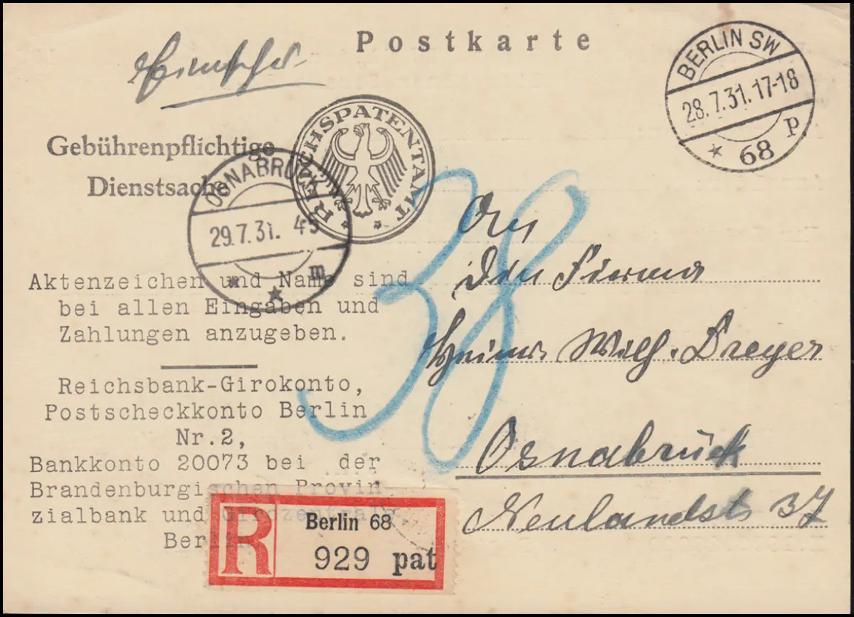 Affaire de service à payer Office du brevet du Reich BERLIN 28.7.1931 sous forme de carte postale R