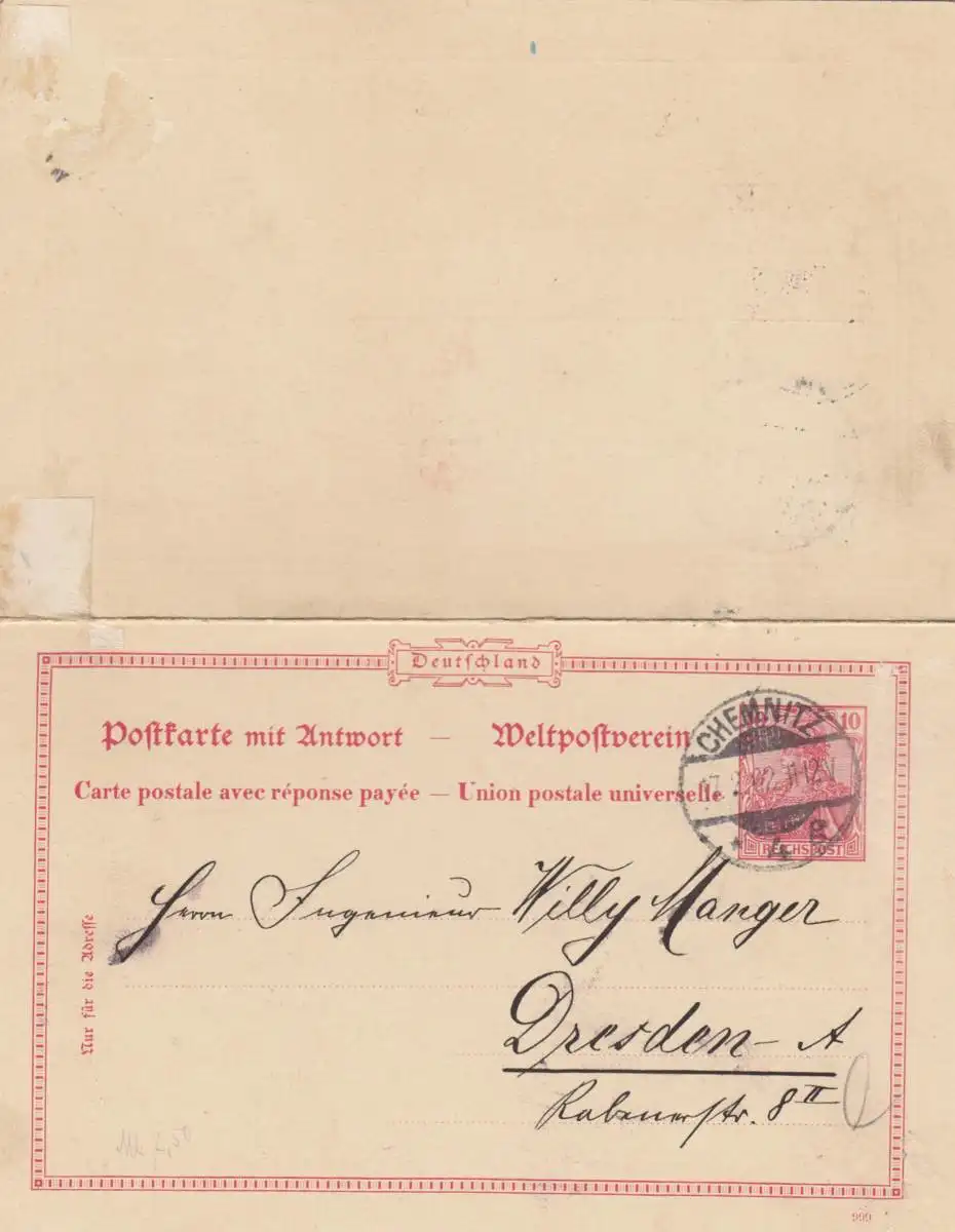 Affaire entière Chemnitz 1902 selon Dresde avec carte de réponse non utilisée
