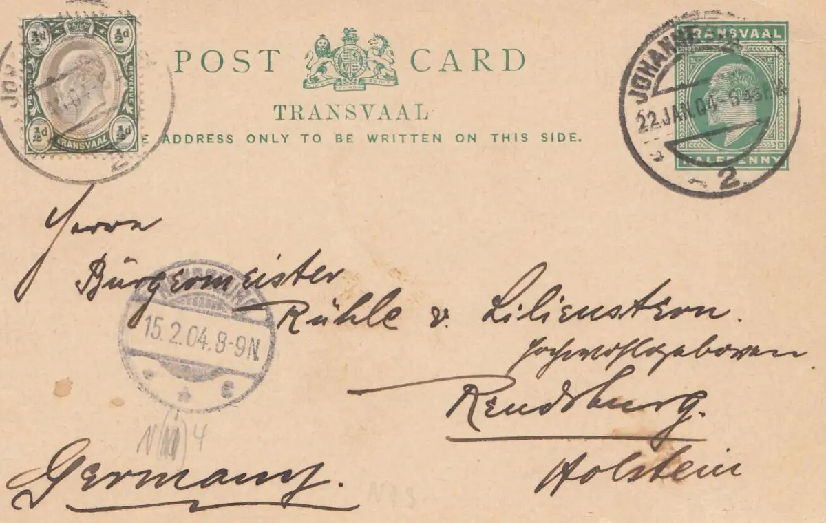 Afrique du Sud 1904: Johannesburg Post card to Rendsburg