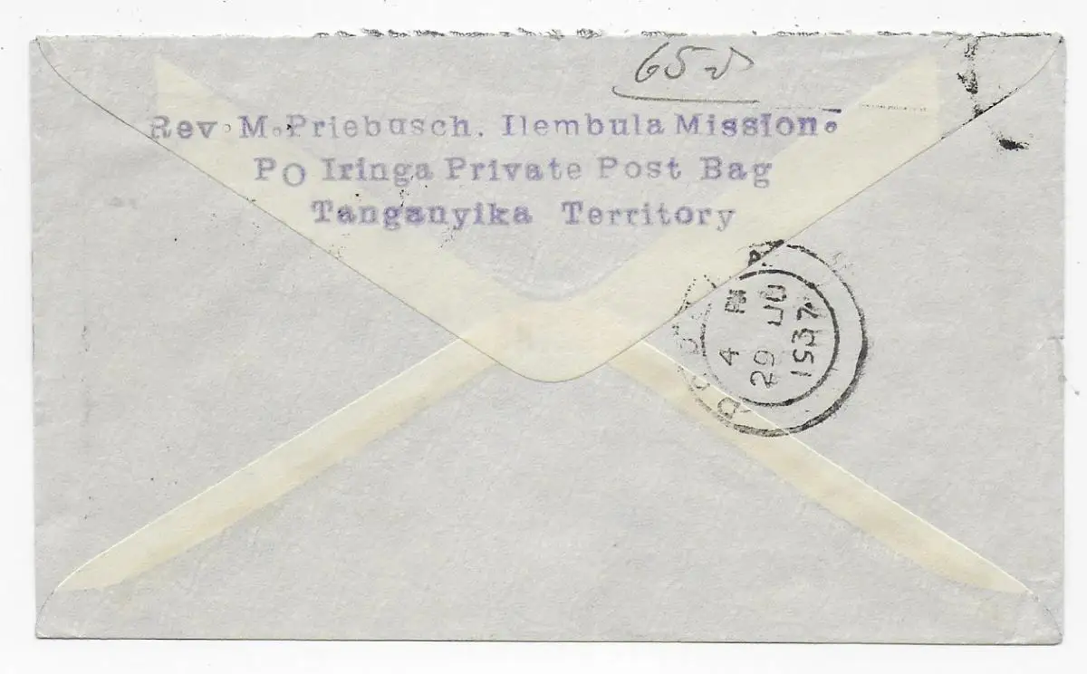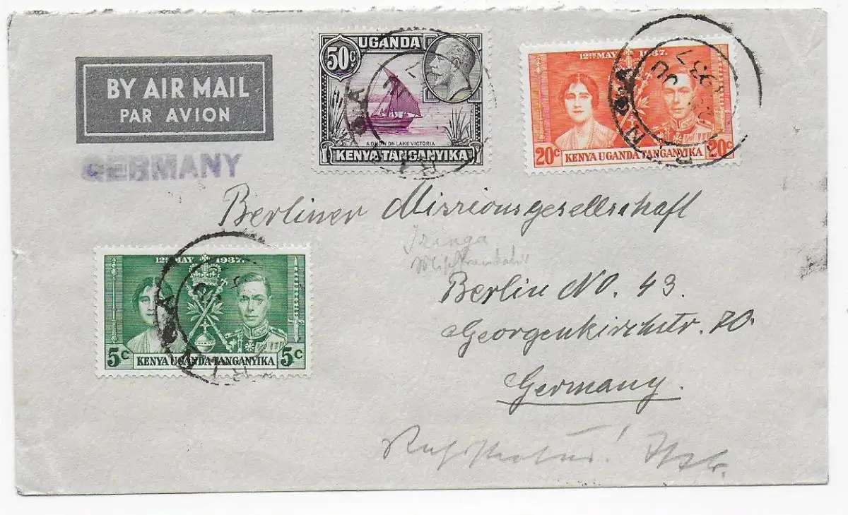 Air mail, courrier privé bag, territoire de Tanganyika, Ilembla Mission 1937 à Berlin