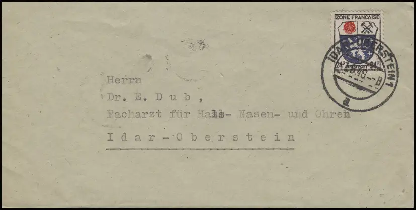 Edition générale 9 Armoiries 24 Pf. EF sur la lettre locale IDAR OBERSTEIN 1.8.46