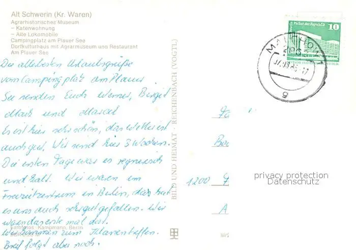 Alt_Schwerin Agrarhistorisches Museum Katenwohnung Lokomotive Campingplatz Plauer See Dorfkulturhaus Alt_Schwerin postalisch gelaufen 1985 Erhaltung siehe scans [FriedD77] Frierer