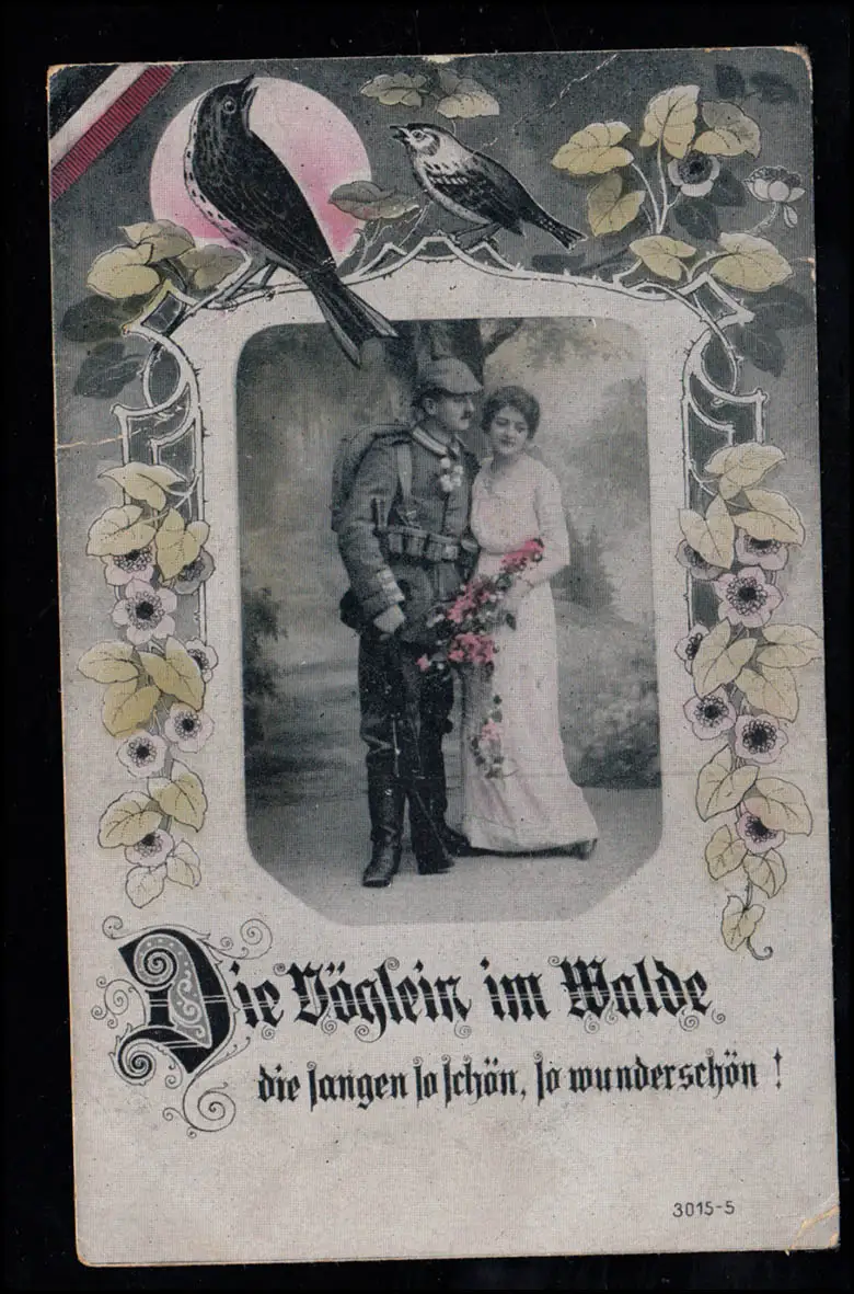 Amour-AK Couple d'amour en uniforme avec oiseaux, VIECHTACH 19.3.1917