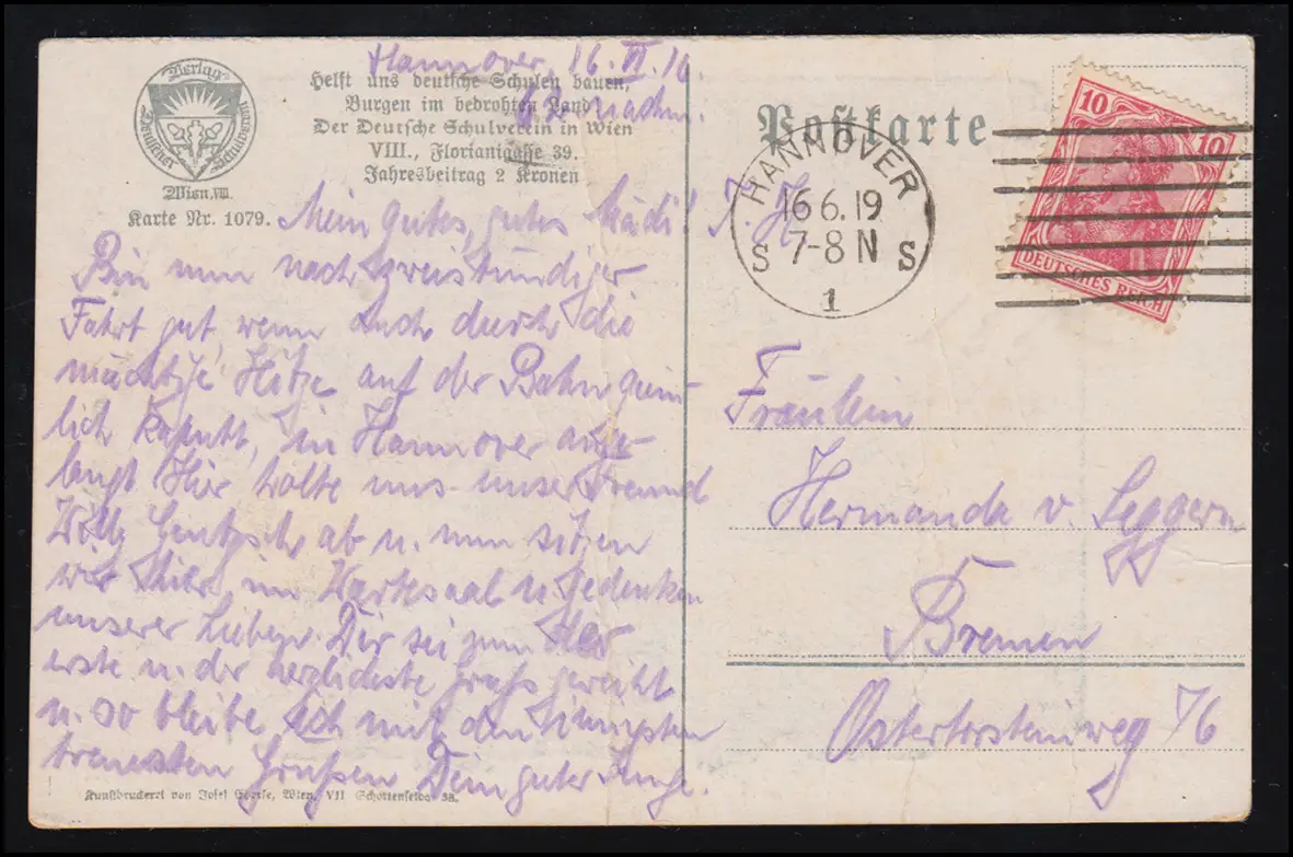 Editeur Deutscher Schulverein Wien / HANNOVER 16.6.1919, Carte übegig Test: original Référence produit: 00000000014636