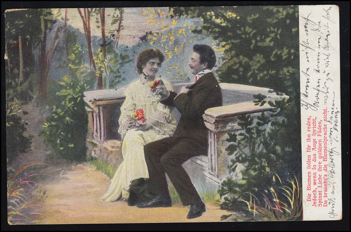 Amour-AK couple d'amour sur le banc - Poème: Que les fleurs parlent pour lui ...