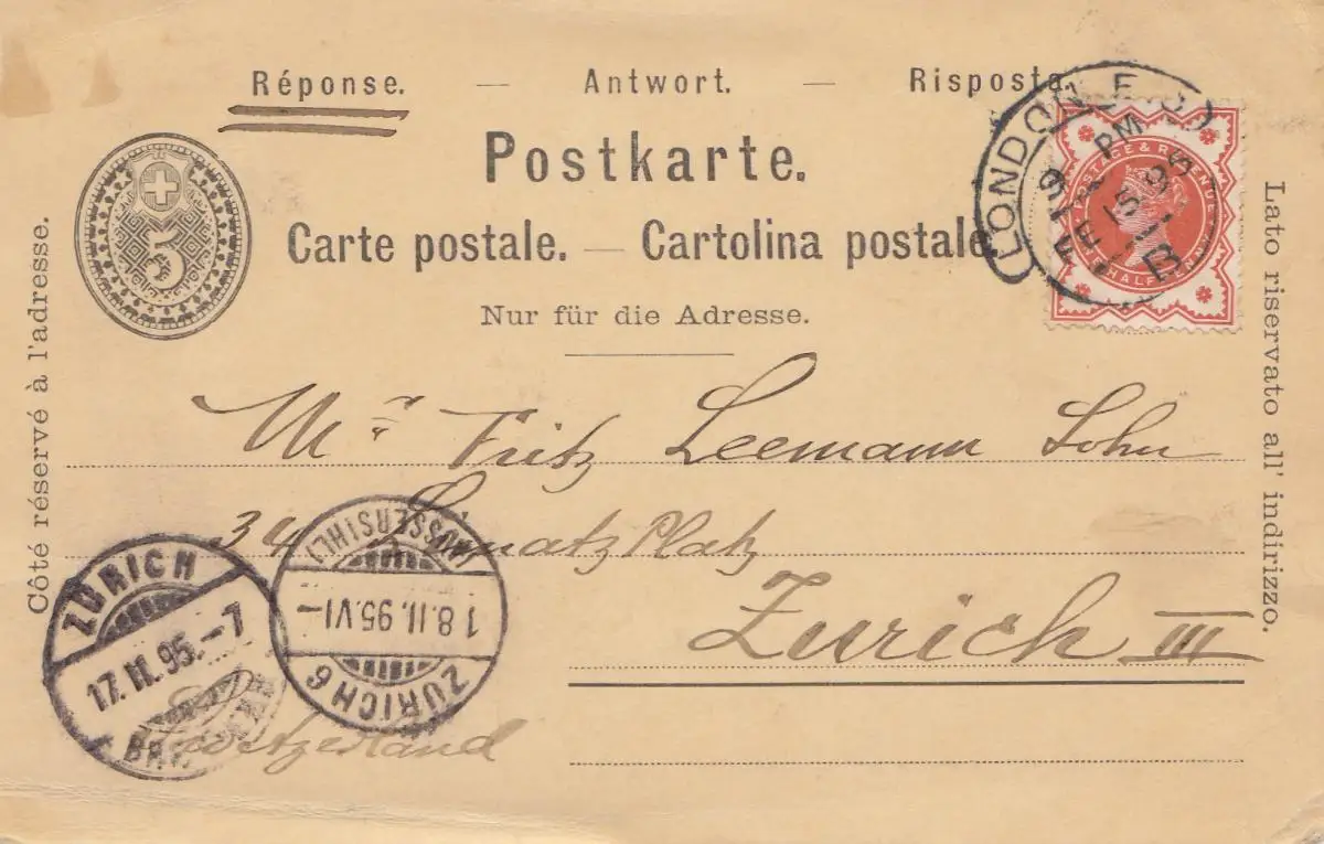 Angleterre: 1895: Londres vers Zurich/Suisse - Carte de réponse