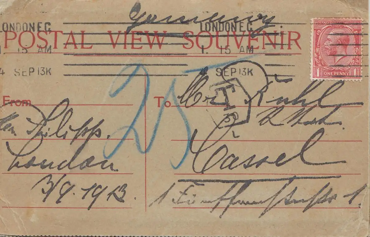 Angleterre: 1913: Souvenir de la revue postale Londres vers Kassel: bloc de texte à l'intérieur