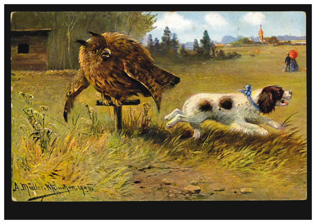 Animaux A. Müller: hibou et chien, édition C.B.St. 9302, inutilisé vers 1910