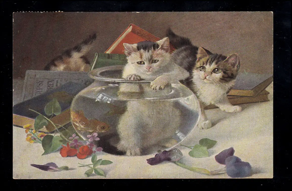 Animaux AK Chat enfant dans le verre de poisson, marque Egèmes, BREGENZ 1909