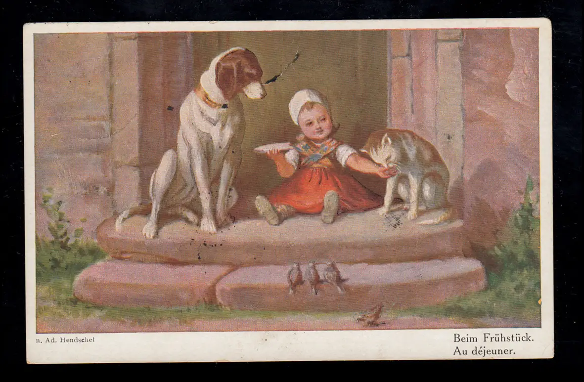 Animaux AK Hendschel: Au petit déjeuner - fille nourrit chat chat oiseaux PLAFON 1920