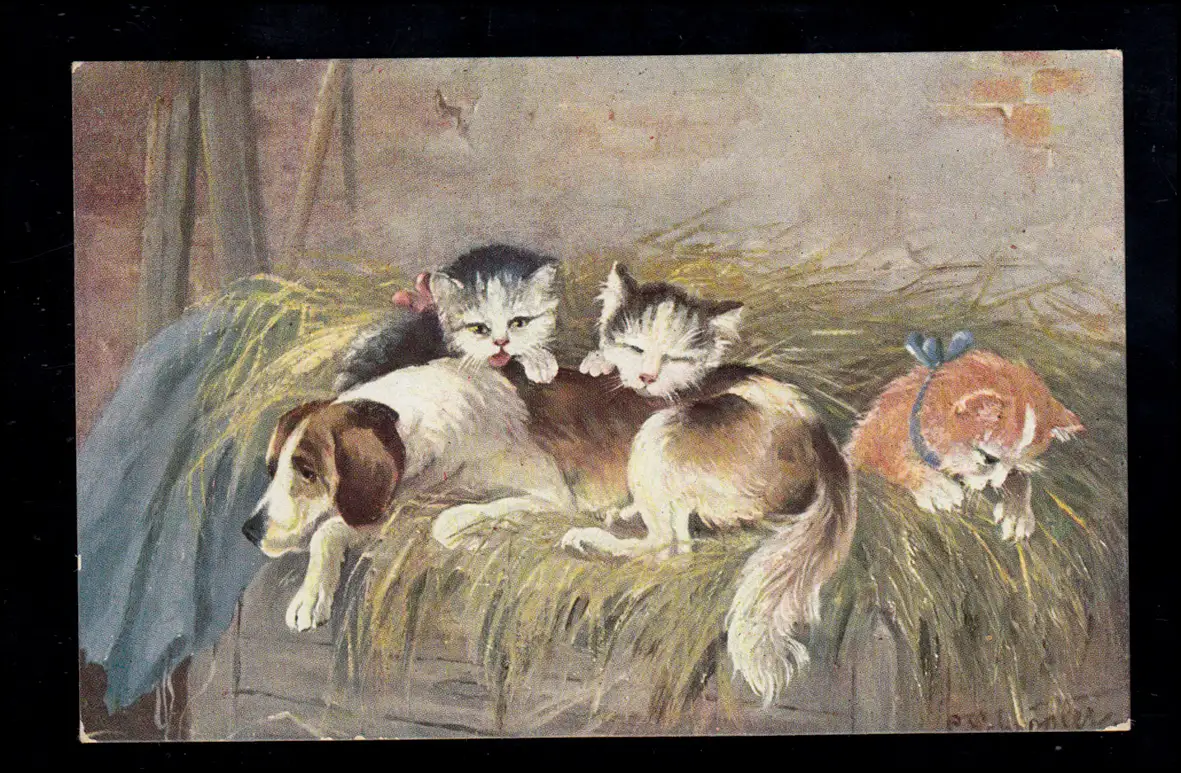 Animaux-AK chien endormi avec des chats dans la grange, BREGENZ 15.3.2009