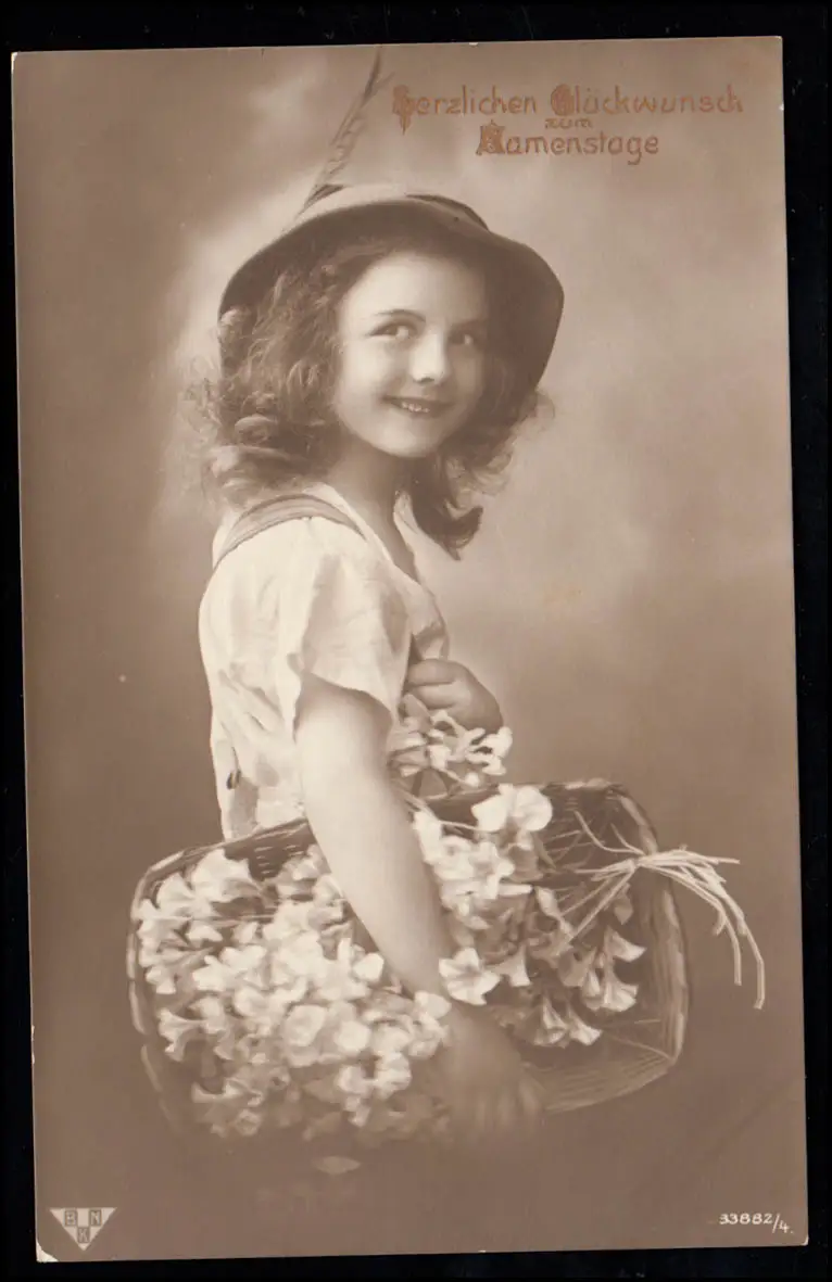 Anniversaire de l'enfant: Fille souriante avec panier de fleurs, WALSDEE (WURTT.) 1913