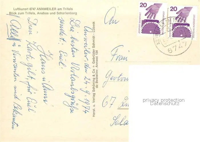 Annweiler_Trifels Fliegeraufnahme mit Trifels Anebos und Scharfenberg Annweiler_Trifels postalisch gelaufen 1974 Erhaltung siehe scans [LiesaD40] LiesID40