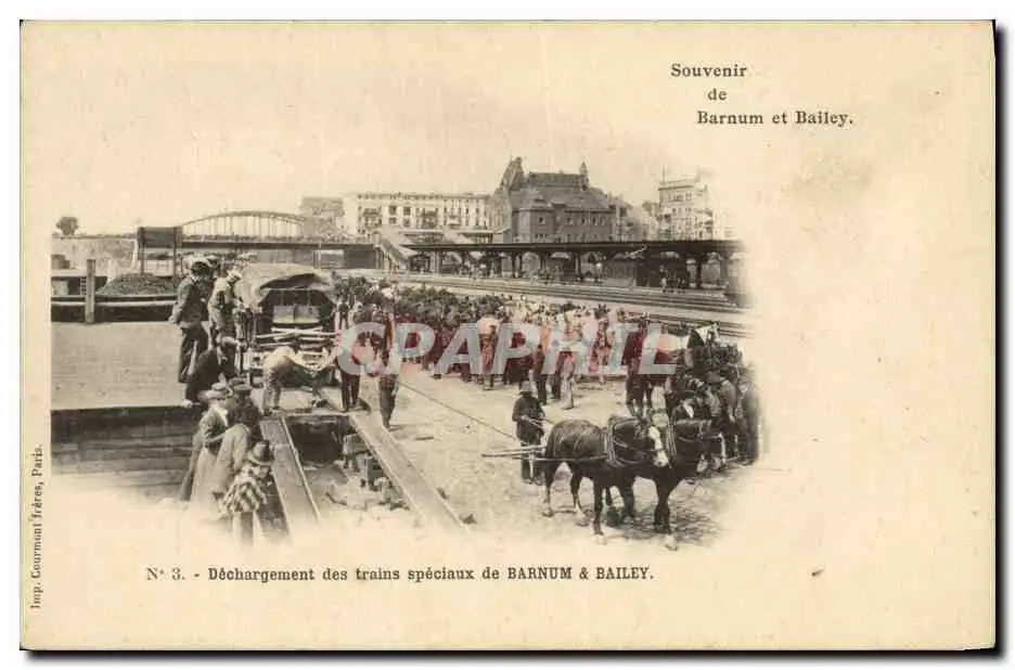 Cartes postales Cirque Barnum et Bailey Dechargement des trains speciaux Chevaux Clown