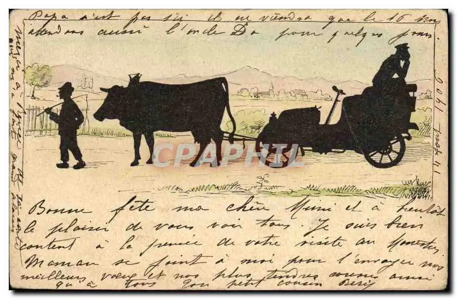 Cartes postales Contre la lumiere Attelage Boeuf Automobile