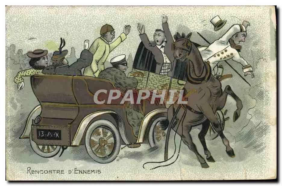 Cartes postales Fantaisie Automobile Cheval Rencontre d'ennemis