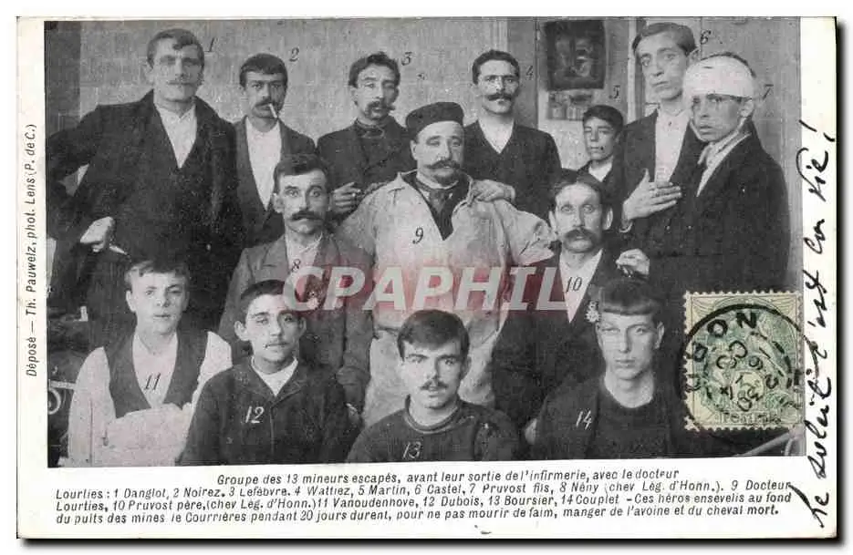 Cartes postales Mine Mines Groupe des 13 mineurs rescapes avant leur sortie de l&#39infirmerie TOP Courrieres