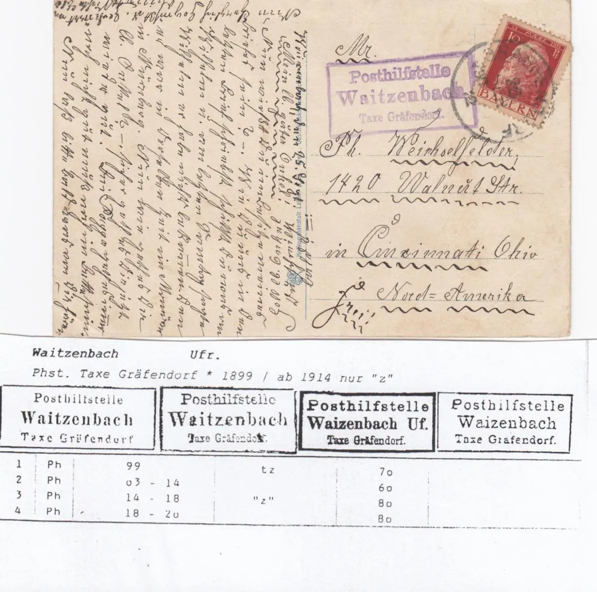 Carte postale Bamberg, poste d'aide de Waitzenbach vers Cincinnati/Ohio USA