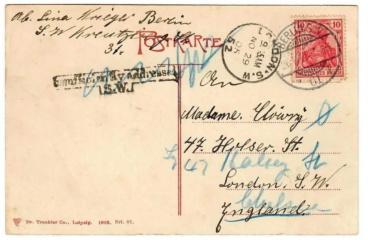Carte de Berlin Panorama, 1905 à Londres, adresse insuffisante