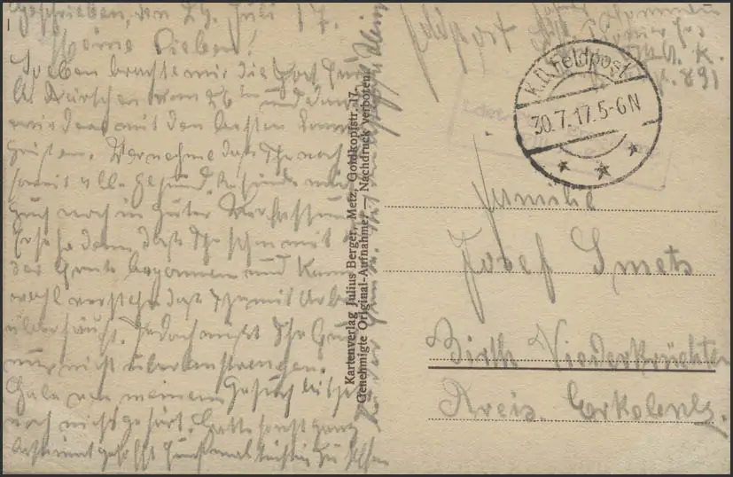 Carte de vue Post de champ Lorry-Mardigny, 30.7.1917 après Birth/Niederkraften
