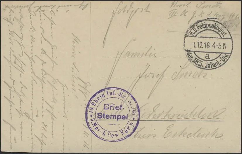 Carte de vue Poste de champ Pezonne, Masch-Gew.-Comp.1.12.16 n. Birth/Niederkrachten