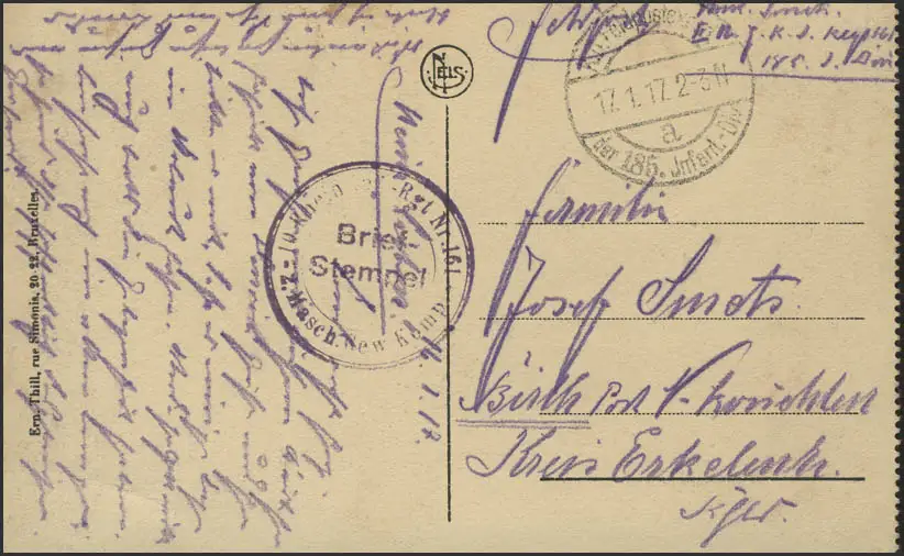 Carte de la liste de l'affiche Feldpost Westende, Masch.-Gew. Company 17.1.17 n. Birth/Niederkr.