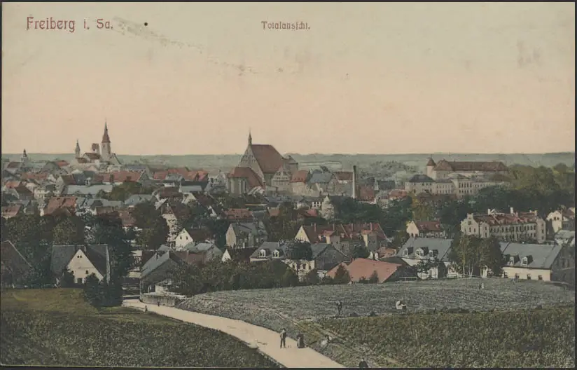 Carte de vue Freiberg en Saxe: vue totale colorée, inutilisé environ 1900