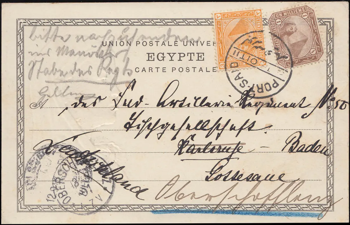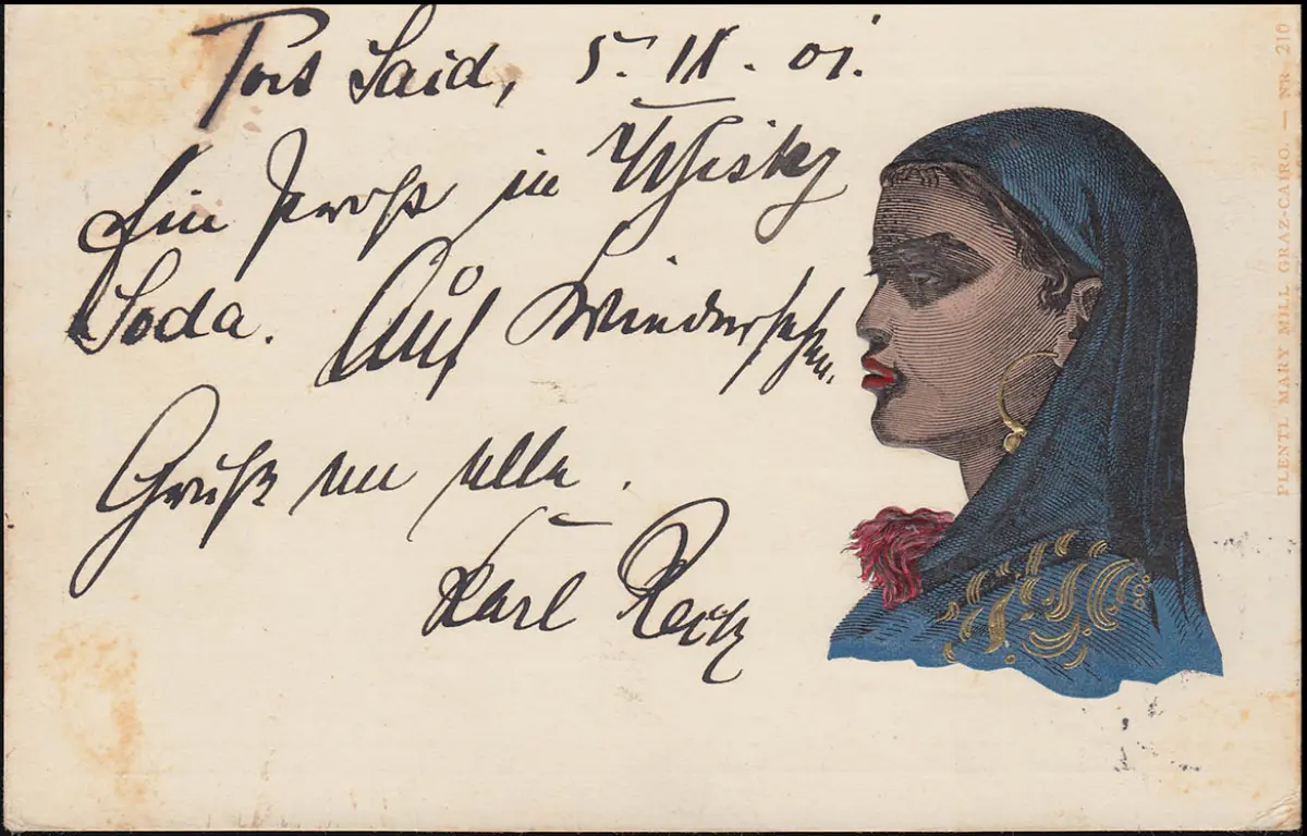 Ansichtskarte Port Said Frau in Tracht nach Oberschefflenz über Karlsruhe 1901
