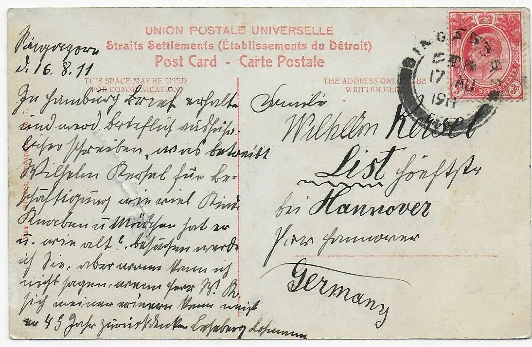 Carte de vue Singapore 1911 to Hannover/Germany