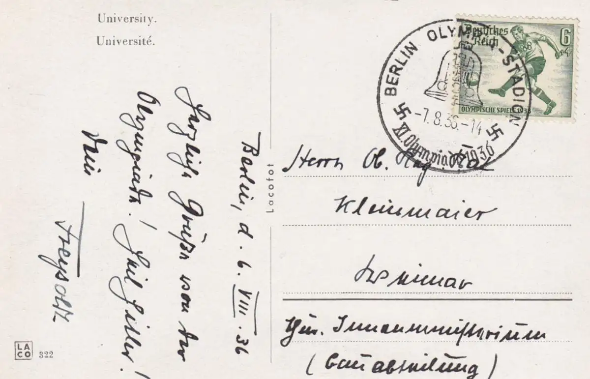 Carte de l'Université de Berlin, 1936, Tampon spécial Olympiade, Stade
