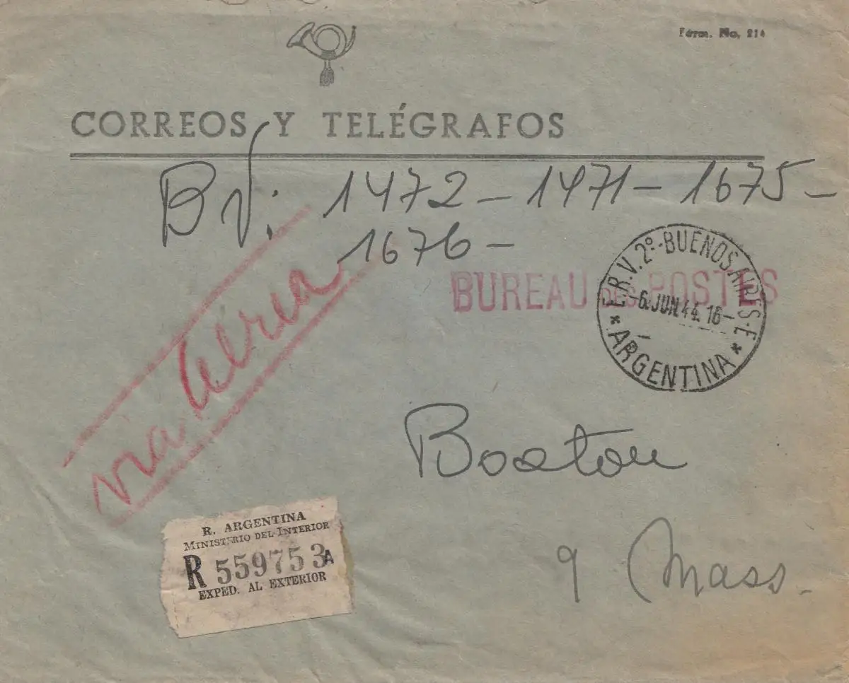 Argentine: 1944: Enregistré Ministerio del Interior vers États-Unis/Boston Mass.