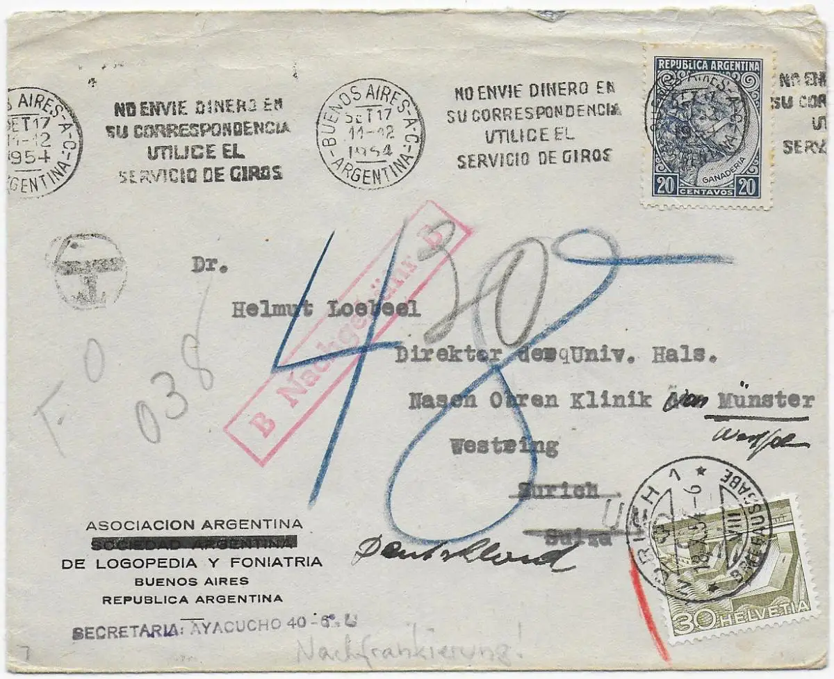 Argentine: Buenos Aires 1954 à Zurich et transfert et frais supplémentaires