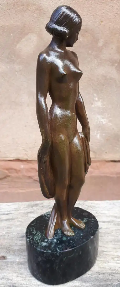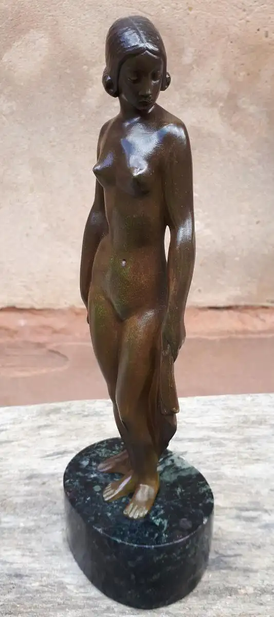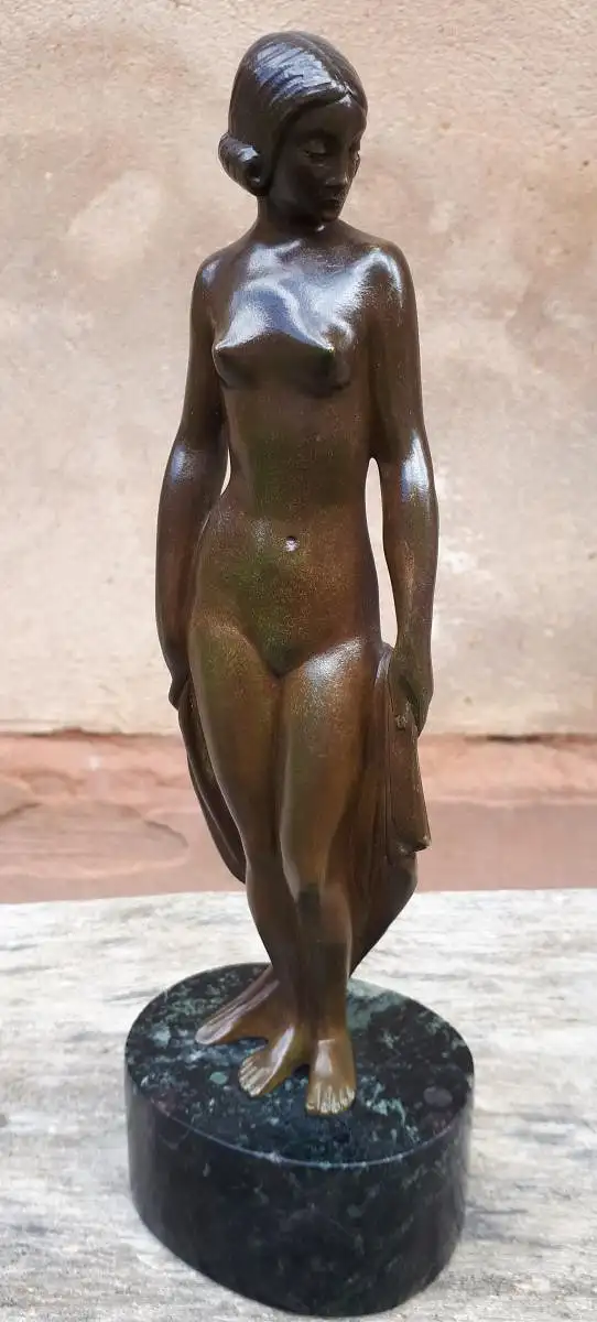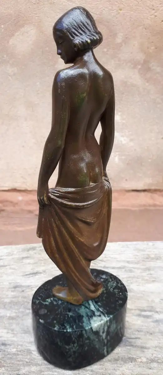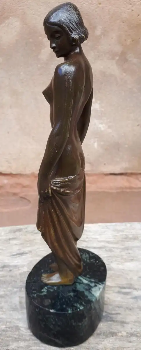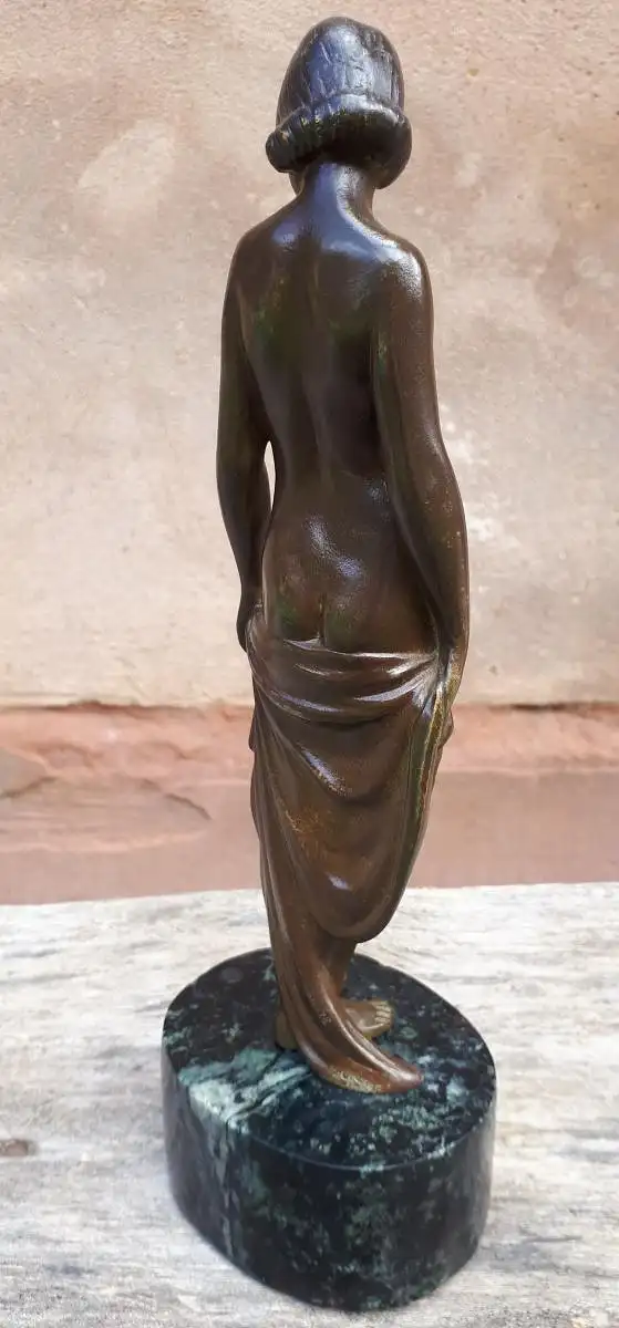 Elegant bronze sculpture with brown patina with green nuances representing a naked woman in drapery.