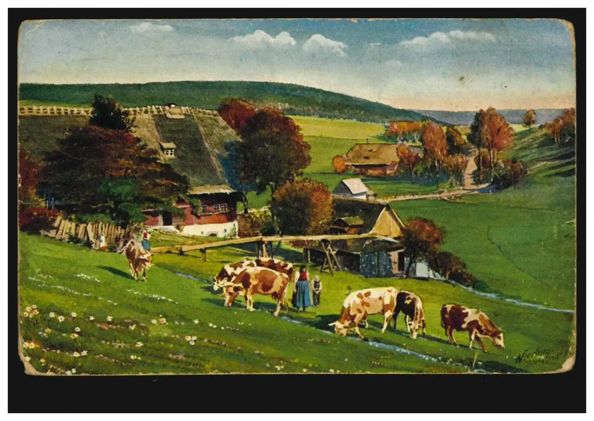 Artiste-AK Schwarzwaldhaus dans la vallée de Schilatcht avec le troupeau de bovins, poste de campagne 1914/1918