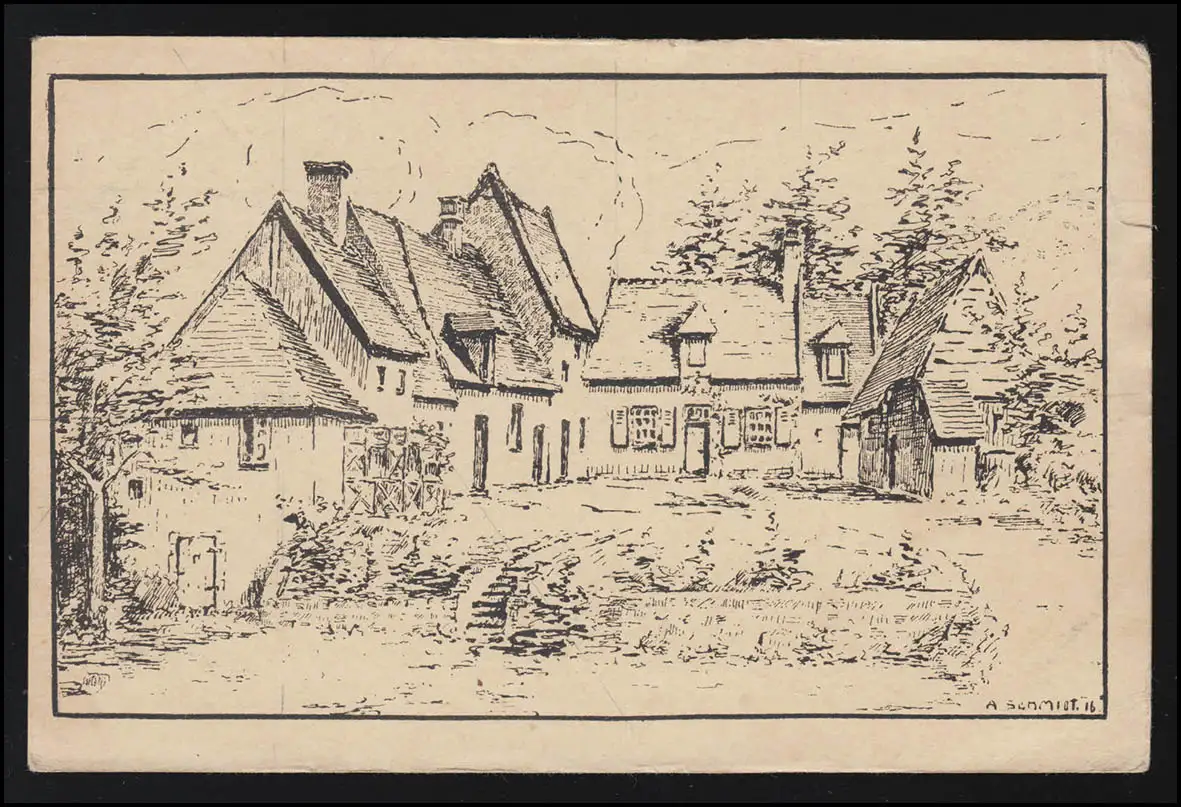 Artiste Érassure petit village paisible, signe A.Schmidt, Feldpost 14.7.1916
