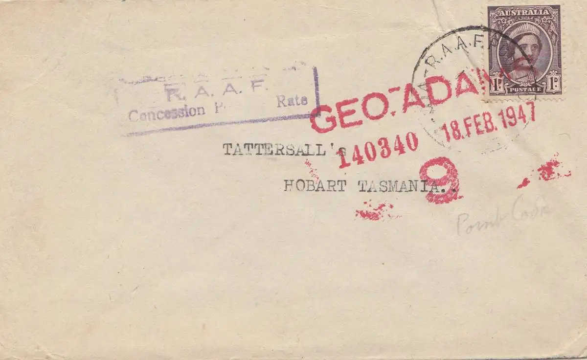 Australia 1947: R.A. A.F to Hobart-Tasmania - Concession postage rate
