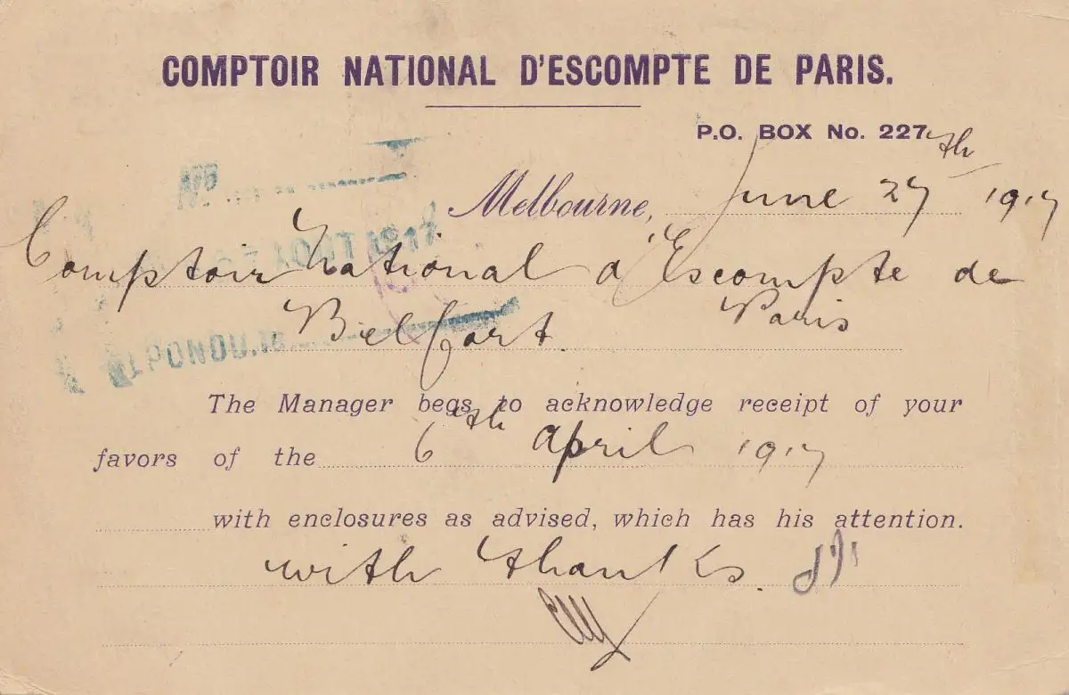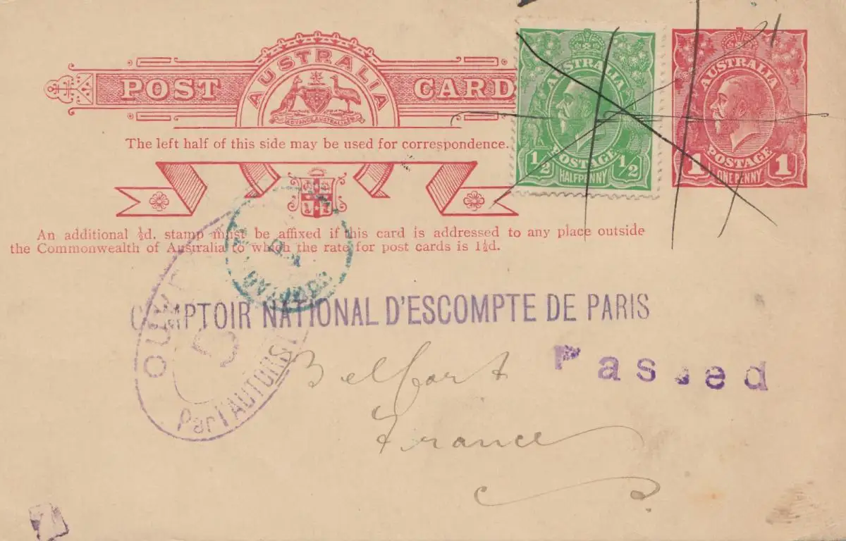 Australie: 1919: Melbourne post card to Paris, centre, passed